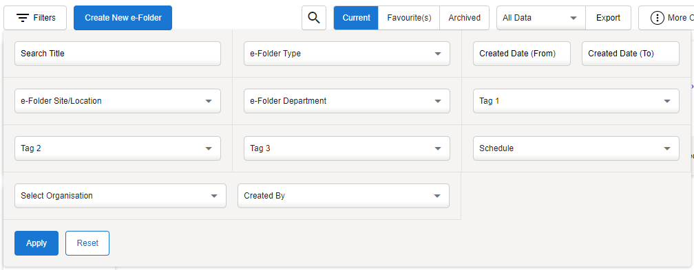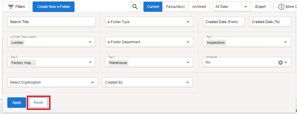 Reset Filters 04 October 2024 16:20 Updated Go to e-Checklists > Administration > Click on Filters Click Reset to reset all filters OR Click Reset to remove all filters