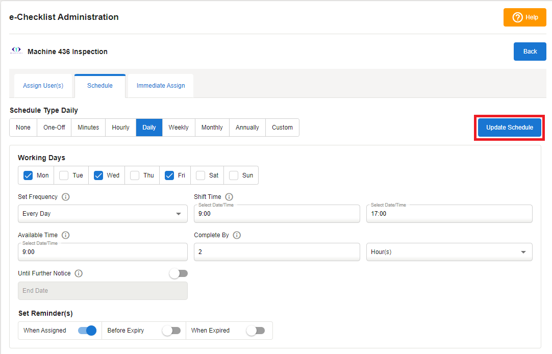 Select the day(s) on which the e-Checklist to be available