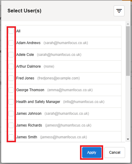 Tick the user(s) you wish to email. Click Apply