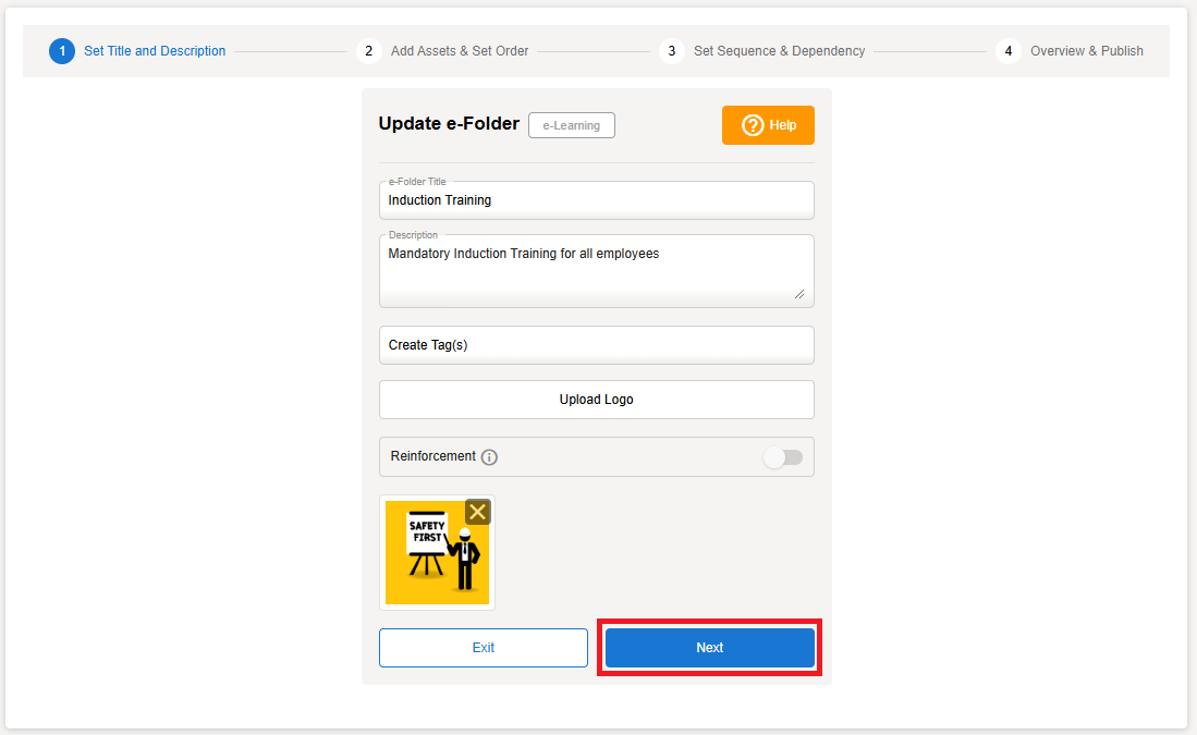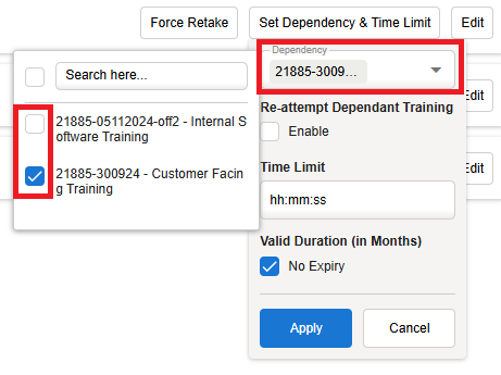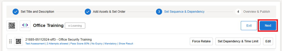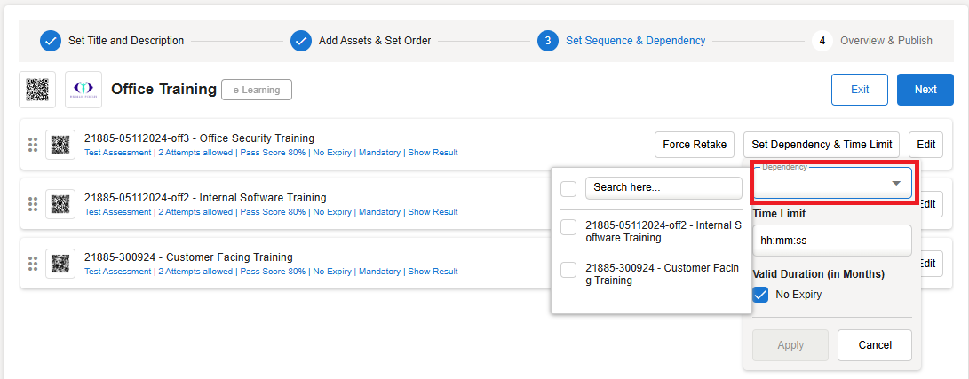 If your e-Folder has multiple courses, select Set Dependency on a course. This will ensure users can only take the courses, in the order you choose.