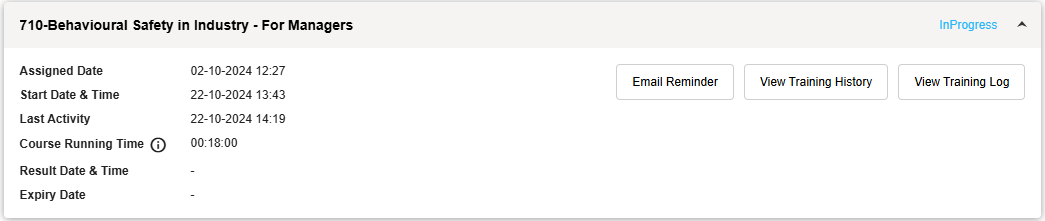 You can generate Email Reminders for training with In Progress, Failed, Expiring, Expired or To Do training status.