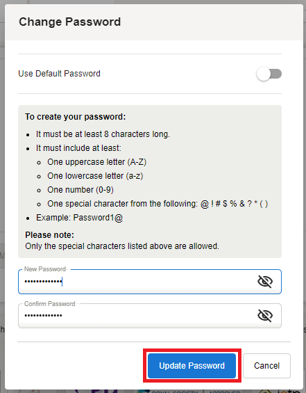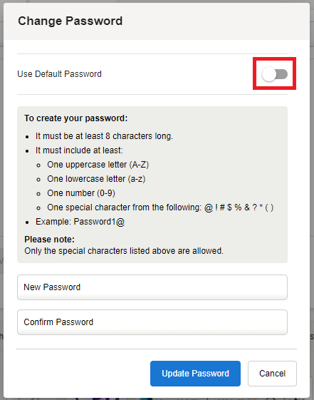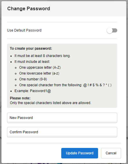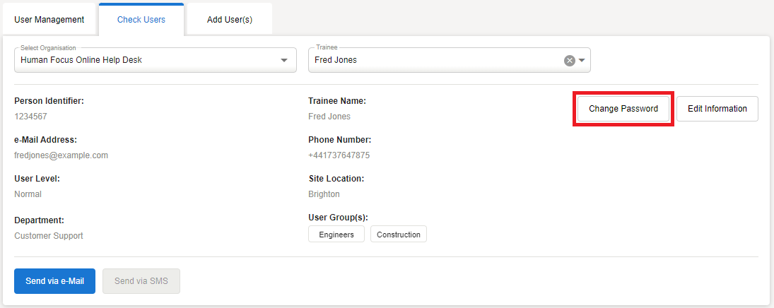 Select Use Default Password to reset the password. Please email info@humanfocus.co.uk to confirm the default password.