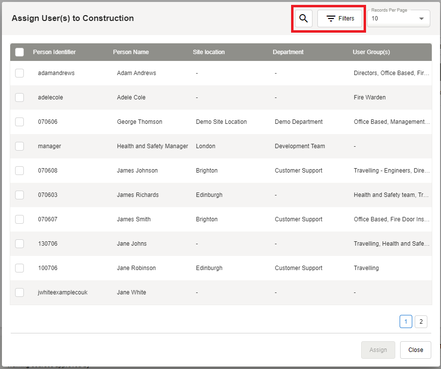 Use the Search option or the Filters to quickly locate the users you need