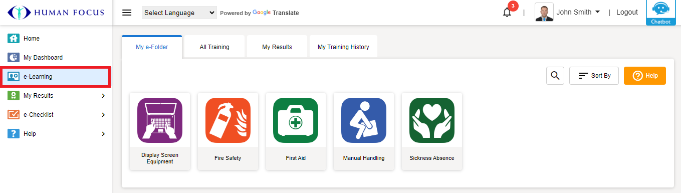 To locate your training, click on e-Learning on the left side navigation tree