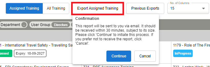 To receive the report in an email link, select Export Assigned Training / Export All Training