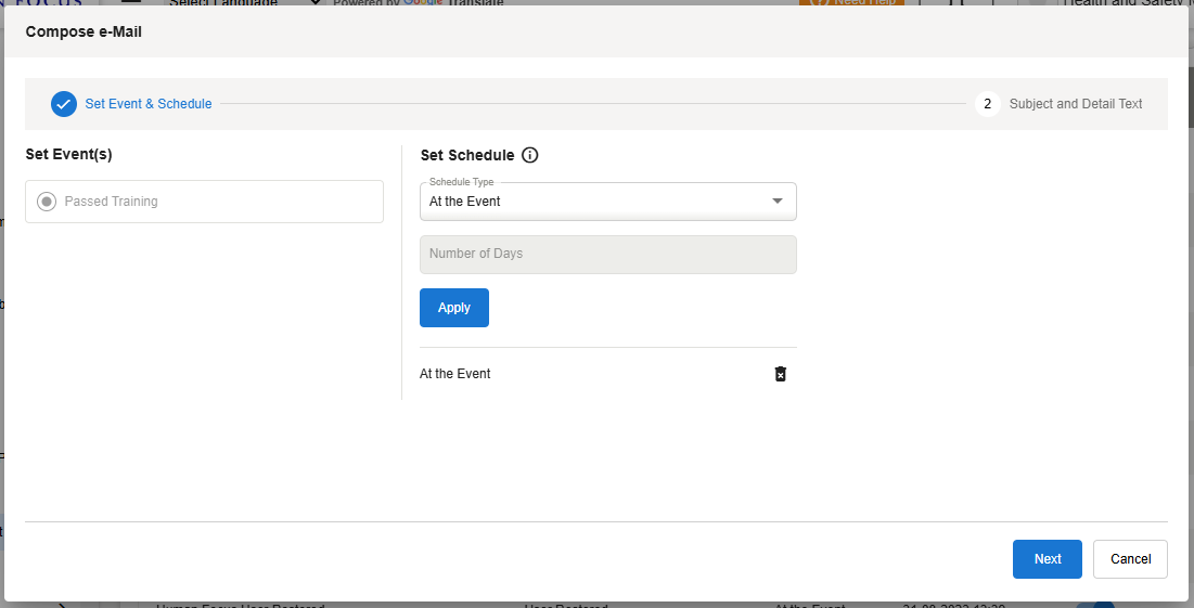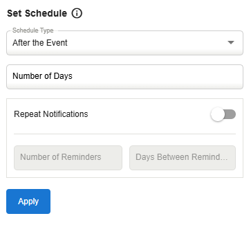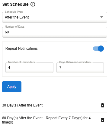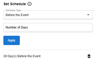 Select the number of days this alert will be sent before the event occurs and click Apply